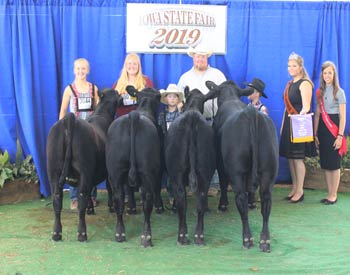 Janssen Angus, Earlham, Iowa,won produce-of-dam at the 2019 Iowa State Fair Angus Show, Aug. 13 in Des Moines, Iowa. Janssen Greystone Janet 5006 produced the winning group. Photo by Adam Conover, American Angus Association.