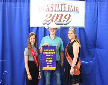 Rowdi Van Zee, Sioux Center, Iowa, center, won premier exhibitor at the 2019 Iowa State Fair Angus Show, Aug. 13 in Des Moines, Iowa. Pictured presenting the award are Allie Bieber, Iowa Angus princess, left, and Maggie Maas, Miss Iowa Angus, right. Photo by Adam Conover, American Angus Association.