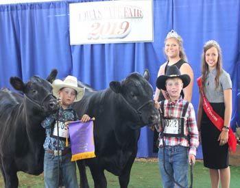 Jensen Georgina 726 of FAF won grand champion cow-calf pair at the 2019 Iowa State Fair Angus Show, Aug. 13 in Des Moines, Iowa. Cale Jensen, Plainfield, Iowa, and Callie Jensen, Plainfield, Iowa, own the January 2017 daughter of Colburn Primo 5153. A February 2019 heifer calf sired by S A V Sensation 5615 completes the winning pair. Kyle Conley, Sulphur, Okla., evaluated the 164 entries. Photo by Adam Conover, American Angus Association.
