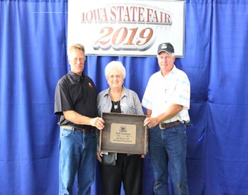 Ted Greiman, Garner, Iowa, left, was presented with the Bob Schultz Memorial Award at the 2019 Iowa State Fair Angus Show, Aug. 13 in Des Moines, Iowa. Pictured presenting the award are Mary Schultz, center, and Doug Schroeder, right. Photo by Adam Conover, American Angus Association.