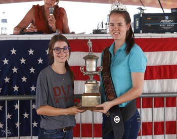 Katelyn Eathington, Avon, Ill., left, received the Joseph Bessler Memorial Award at the 2020 Illinois Junior Angus Association Field Day, July 4 in Bloomington, Ill. Emily Brooks, Miss Illinois Angus is pictured presenting the award. Photo by Cindy Cagwin-Johnston.