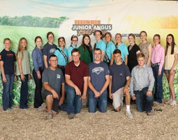 These young Illinois men and women were elected to serve on the Illinois Junior Angus Association board of directors and are pictured at the 2020 Illinois Junior Angus Association Field Day, July 4 in Bloomington, Ill. Pictured knelling from left are Reed Naughton, Atlanta, director; Charlie Parr, Mason City, director; Eric Schafer, Owaneco, vice president; Jack Dameron, Towanda, director; and Ben Sellmeyer, Maroa, director. Standing back row from left are Reese Anderson, Chrisman, treasurer; Anne Dameron, Towanda, director; Lindsey Decker, Philo, president; Ashlyn Mool, Lexington, director; Amelia Miller, Gridley, second vice president; Ella Brooks, Prophetstown, director; Keegan Cassady, Bloomington, National Junior Angus Board membership director; Emily Brooks, Prophetstown, show secretary; Brooke Schiffbauer, Tonica, director; Lizzie Schafer, Owaneco, reporter; Paige Lemenager, Hudson, secretary; Lauren Wolter, Aviston, director; Holly Marsh, Earlville, director; and Addison Bartlow, Monticello, director. Photo by Cindy Cagwin-Johnston.