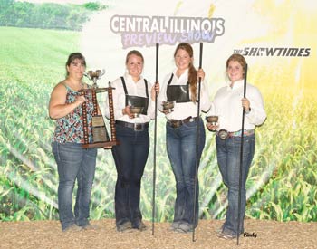 These junior Angus members qualified to represent Illinois at the National Junior Angus Showmanship Contest held in conjunction with the National Junior Angus Show this July in Tulsa, Okla., at the 2020 Illinois Junior Angus Association Field Day, July 4 in Bloomington, Ill. Pictured from left are Nicole Daugherty, presenting; Lauryn Mool, Lexington, Ill., first qualifier and winner of the George Sperry Memorial Trophy; Sheridan Hank, Aledo, Ill., second qualifier; and Maddie Fugate, Mahomet, Ill., second alternate. Photo by Cindy Cagwin-Johnston.