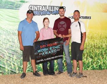 Lindsey Decker, Philo, Ill., received the Beryle Rutledge Memorial Work Ethic Award at the 2020 Illinois Junior Angus Association Field Day, July 4 in Bloomington, Ill. Pictured from left are Branden Rutledge, presenting; Lindsey Decker, recipient; Sam Brumleve and Brock Rutledge, both presenting. Photo by Cindy Cagwin-Johnston.
