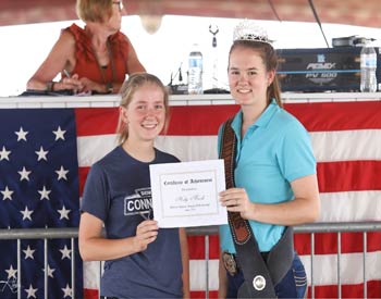 Holly Marsh, Earlville, Ill., left, received the Illinois Angus Association scholarship at the 2020 Illinois Junior Angus Association Field Day, July 4 in Bloomington, Ill. Also pictured is Emily Brooks, Miss Illinois Angus, presenting, right. Photo by Cindy Cagwin-Johnston.