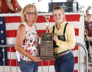 Paige Lemenager, Hudson, Ill., right, was presented with the Troy Miller Memorial Award at the 2020 Illinois Junior Angus Association Field Day, July 4 in Bloomington, Ill. Pictured presenting the award is Tracy Rawlings. Photo by Cindy Cagwin-Johnston.