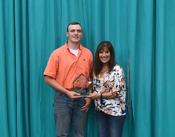Eric Schafer, Owaneco, Ill., left, won the Crystal Award at the 2019 National Junior Angus Show (NJAS) Awards Ceremony, July 14-20 in Louisville, Ky. The awards are presented by the American Angus Auxiliary to the top boy and top girl in contest performance. Also pictured presenitng is Kathi Creamer, American Angus Auxiliary Crystal Award chairperson. Photo by Pearls Pics, on behalf of the American Angus Association.