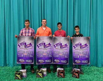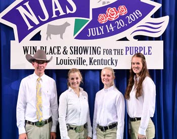 Illinois junior members won third place finish in the fitting contest at the 2019 National Junior Angus Show (NJAS) Awards Ceremony, July 14-20 in Louisville, Ky. Pictured from left are Skyler Fischer, Freeport; Eric Schafer, Owaneco; Tyler Musgrave, Willow Hill; and Adam Miller, Gridley. Photo by Pearls Pics, on behalf of the American Angus Association.