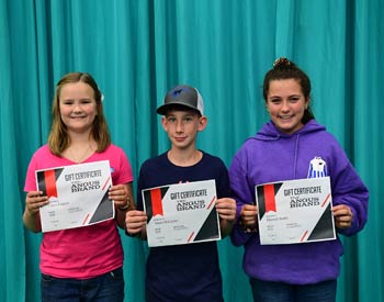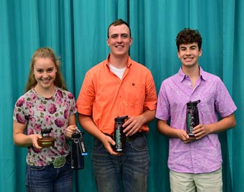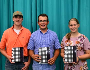 These junior members won top honors in the junior division of creative writing at the 2019 National Junior Angus Show (NJAS) Awards Ceremony, July 14-20 in Louisville, Ky. Pictured from left are Nate Bowman, Germanton, N.C., first; Emily Warren, Gamaliel, Ky., second; and Brantley Humpert, Windthorst, Texas, third. Photo by Pearls Pics, on behalf of the American Angus Association.