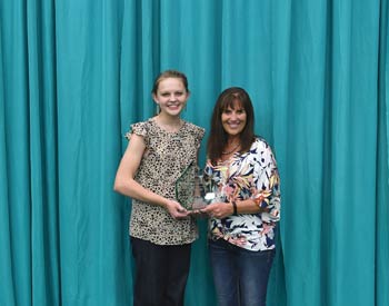 Lauren Wolter, Aviston, Ill., left, won the Crystal Award at the 2019 National Junior Angus Show (NJAS) Awards Ceremony, July 14-20 in Louisville, Ky. The awards are presented by the American Angus Auxiliary to the top boy and top girl in contest performance. Also pictured presenitng is Kathi Creamer, American Angus Auxiliary Crystal Award chairperson. Photo by Pearls Pics, on behalf of the American Angus Association.
