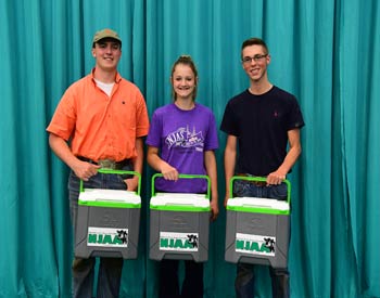 These junior members were overall winners in the intermediate A division career development at the 2019 National Junior Angus Show (NJAS) Awards Ceremony, July 14-20 in Louisville, Ky. Pictured from left are Jordyn Wickard, Greenfield, Ind., first; Tucker Stagemeyer, Page, Neb., second; and Ryan Borer, Buchanan, Va., third. Photo by Pearls Pics, on behalf of the American Angus Association.