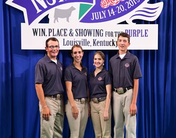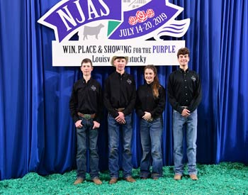 Virginia junior members won first place finish in the fitting contest at the 2019 National Junior Angus Show (NJAS) Awards Ceremony, July 14-20 in Louisville, Ky. Pictured from left are Kallie Poole, Staunton; Ryan Borer, Buchanan; Zach McCall, Greenville; and Gordon Clark, Gretna. Photo by Pearls Pics, on behalf of the American Angus Association.
