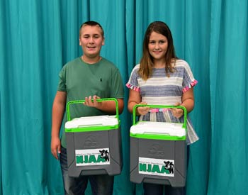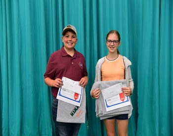 These junior members won top honors in the beef science poster interview division at the 2019 National Junior Angus Show (NJAS) Awards Ceremony, July 14-20 in Louisville, Ky. Pictured from left are Daniel Humpert, Windthorst, Texas, first; and Eliza Patchin, Mitchellville, Iowa, second. Photo by Pearls Pics, on behalf of the American Angus Association.