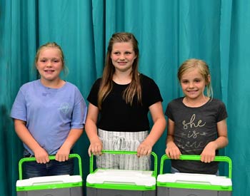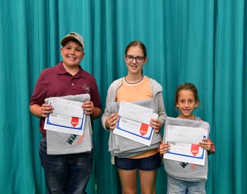 These junior members won top honors in the junior division of the skill-a-thon contest at the 2019 National Junior Angus Show (NJAS) Awards Ceremony, July 14-20 in Louisville, Ky. Pictured from left are Lilly Larson, Okeechobee, Fla., first; Jackson Hagood, Minor Hill, Tenn., second; and Josey Meier, Jackson, Mo., third. Photo by Pearls Pics, on behalf of the American Angus Association.
