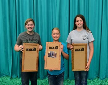 These junior members won top honors in the intermediate division of creative writing at the 2019 National Junior Angus Show (NJAS) Awards Ceremony, July 14-20 in Louisville, Ky. Pictured from left are Mardee Sadowsky, Eagleville, Mo., first; Alexis Koelling, Curryville, Mo., second; and Elizabeth Rone, Courtland, Miss., third. Photo by Pearls Pics, on behalf of the American Angus Association.