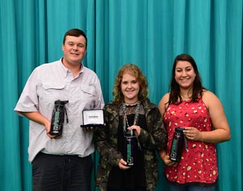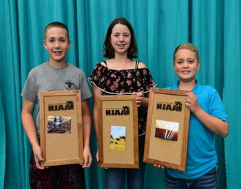 These junior Angus members won top honors in the junior division of photography--around the farm or ranch at the 2019 National Junior Angus Show (NJAS) Awards Ceremony, July 14-20 in Louisville, Ky. Pictured from left are Paighton Witt, Leslie, Mo., first; Austin Woodrow, Emporia, Kan., second; and Cheyenne Houk, Blakesburg, Iowa, third. Photo by Pearls Pics, on behalf of the American Angus Association.