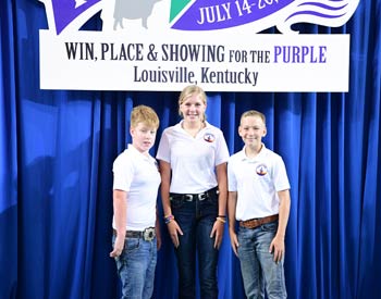 Indiana junior members won third place in the junior division of team sales at the 2019 National Junior Angus Show (NJAS) Awards Ceremony, July 14-20 in Louisville, Ky. Pictured from left are Bryce Hofing, Coatesville; Sophia Royer, Westpoint; and Kayden Nowatzke, Michigan City. Photo by Pearls Pics, on behalf of the American Angus Association.