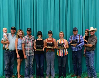 Kansas junior members won first place in the senior division of team sales at the 2019 National Junior Angus Show (NJAS) Awards Ceremony, July 14-20 in Louisville, Ky. The senior team received the Bob Laflin Award in memory of the late Angus breeder who was passionate for junior programs. Pictured from left are Cody Sankey, holding Cyrus Sankey; Lindsay Sankey; Josh Laflin; all presenting; and Channing Schneider, Laura Carpenter, and Mia Hastings, all of Wamego, recipients; and Guy Laflin; and Chris Sankey, holding Caroline Sankey, all presenting. Photo by Pearls Pics, on behalf of the American Angus Association.