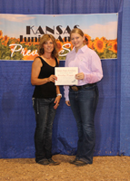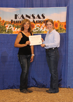 Kady Figge, Onaga, right, received the Kansas Angus Auxiliary Scholarhips at the 2020 Kansas Junior Angus Association Preview Show, June 6-7 in Hutchinson, Kan. Also pictured is Wendy Flory, Kansas Angus Auxiliary president, presenting, left. Photo by Jeff Mafi, American Angus Association.