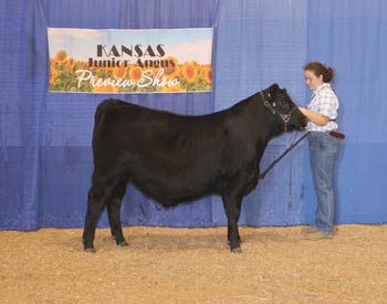 HDCC/SLA Miss Burgess G06 won bred-and-owned junior champion heifer at 2020 Kansas Junior Angus Preview Show, June 6-7 in Hutchinson, Kan. Tanner Hite, Valley Center, Kan., owns the winning heifer. Photo by Jeff Mafi, American Angus Association.