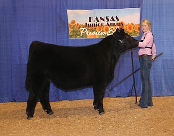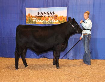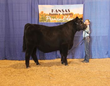 Bar S Pride 9900 won reserve grand champion bred-and-owned female at the 2020 Kansas Junior Angus Association Preview Show, June 6-7 in Hutchinson, Kan. Jayce Dickerson, Paradise, Kan., owns the September 2019 daughter of Silveiras Style 9303. She first claimed fall calf chammpion. Ryan Sweeney, Stillwater, Okla., evaluated the 96 entries. Photo by Jeff Mafi, American Angus Association.