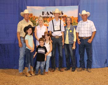 Jayce Dickerson, Paradise, was presented with the Cecil McCurry Keep Smiling Leaders Engaged in Angus Development (LEAD) Award at the 2020 Kansas Junior Angus Association Preview Show, June 6-7 in Hutchinson, Kan. Pictured front row from left are Lydia McGrew, Leo Perez and Lola McGrew, all presenting. Back row from left are Brad and Alicia McCurry, presenting; Jayce Dickerson, recipient; Sandra McCurry and Greg McCurry, presenting. Photo by Jeff Mafi, American Angus Association.