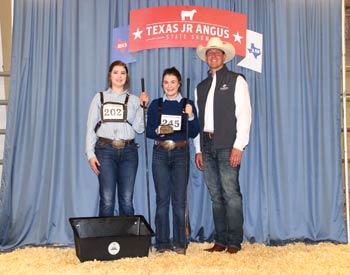 These young Angus breeders won top honors in the intermediate showmanship division at the 2019 Texas Junior Angus Association State Show, June 8-9 in Belton, Texas. Pictured from left are Bailey Bozeman, Lubbock, Texas, second; McKenzie Kostel, Mc Kinney, Texas, first; and Garrett Knebel, judge. Photo by Radale Tiner, American Angus Association.