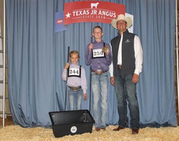 These Angus enthusiasts won top honors in the junior showmanship division at the 2019 Texas Junior Angus Association State Show, June 8-9 in Belton, Texas. Pictured from left are Jera Johnson, Blossom, Texas, second; Pecos Worrell, Harper, Texas, first; and Garrett Knebel, judge. Photo by Radale Tiner, American Angus Association.