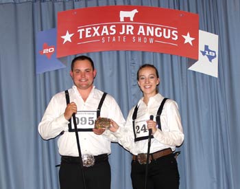 These junior Angus members qualified to represent Texas at the National Junior Angus Showmanship Contest held in conjunction with the National Junior Angus Show this July in Louisville, Ky., at the 2019 Texas Junior Angus Association State Show, June 8-9 in Belton, Texas. Pictured from left are Noah Grounds, Barry, Texas; and Katie Harris, Stanton, Texas. Photo by Radale Tiner, American Angus Association.