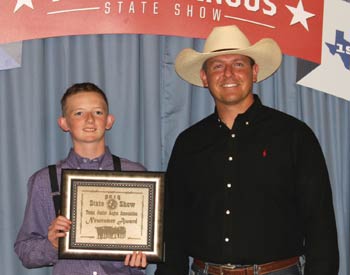 Pecos Worrell, Harper, Texas, left, received the Newcomer award at the 2019 Texas Junior Angus Association State Show, June 8-9 in Belton, Texas. Pictured presenting the award is Garrett Knebel, judge. Photo by Radale Tiner, American Angus Association.