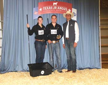 These juniors won top honors in the senior showmanship division at the 2019 Texas Junior Angus Association State Show, June 8-9 in Belton, Texas. Pictured from left are Katlyn Brooks, second, and Noah Grounds, first, both of Barry, Texas; and Garrett Knebel, judge. Photo by Radale Tiner, American Angus Association.