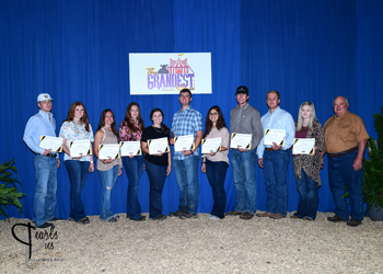 These junior members were awarded the Angus/Talon Youth Educational Learning Program Undergraduate $5,000 Scholarships at the 2021 National Junior Angus Show (NJAS) Scholarship Presentation, July 14-16 in Grand Island, Neb. Pictured kneeling from left are Eva Hinrichsen, Westmoreland, Kan.; Rylie Philipello, Bryan, Texas; and Clay Pelton, Paradise, Kan. Pictured standing back row from left are Jim Brinkley, American Angus Association Board member, presenting; Madison Cox, Eagle Point, Ore.; Nicholas Pohlman, Prairie Grove, Ark.; Cutter Pohlman, Hereford, Texas; Emma Grace Nowotny, New Braunfels, Texas; Alexandria Cozzitorto, Olathe, Kan.; and J. Gordon Clark, Gretna, Va. Since 1998, the Angus Foundation has awarded more than $3.9 million in undergraduate and graduate scholarships to Angus youth. Photo by Pearl's Pics.