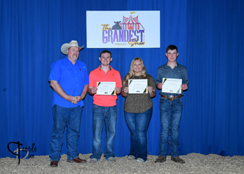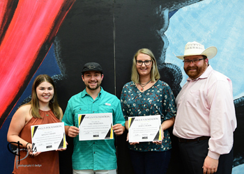 These junior members received the Texas Angus Association $1,000 Scholarships at the 2021 National Junior Angus Show (NJAS) Scholarship Presentation, July 14-16 in Grand Island, Neb. Pictured from left are Mike Ettredge, presenting; Dylan Denny, Lubbock, Texas; Kristen Massingill, Hamilton, Texas; and Colter Pohlman, accepting on behalf of Stuart Lastovica, Salado, Texas. Since 1998, the Angus Foundation has awarded more than $3.9 million in undergraduate and graduate scholarships to Angus youth. Photo by Pearl's Pics.