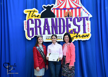 Amelia Miller, Gridley, Ill., center, received the Gary Brost LEAD Conference Award at the 2021 National Junior Angus Show (NJAS) Scholarship Presentation, July 14-16 in Grand Island, Neb. Also pictured presenting the award are Miss American Angus Ellie Kidwell, left, and Anne Patton Schubert, right. Photo by Pearl's Pics.