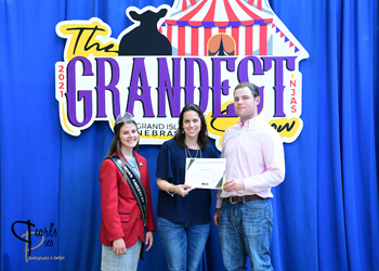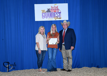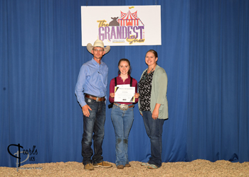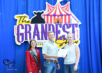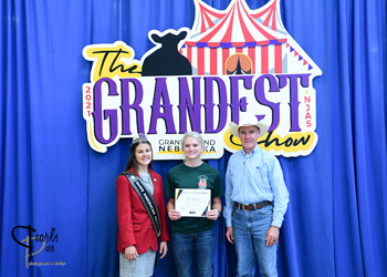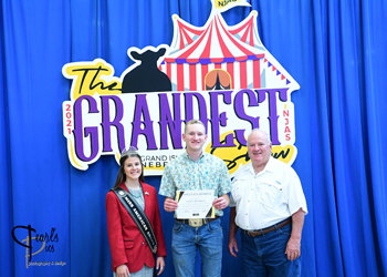 Samuel Henderson, East Troy, Wis., center, received the Richard and Wanda Wilson $1,000 Scholarship at the 2021 National Junior Angus Show (NJAS) Scholarship Presentation, July 14-16 in Grand Island, Neb. Pictured presenting the award is Miss American Angus Ellie Kidwell, left, and Barry Pollard, American Angus Association Board member and Angus Foundation chair, right. Since 1998, the Angus Foundation has awarded more than $3.9 million in undergraduate and graduate scholarships to youth. Photo by Pearl's Pics.