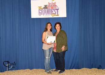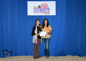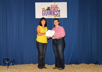 Rachel Smith, Osceola, Neb., left, received the Western States National Junior Angus Show $500 Scholarship at the 2021 National Junior Angus Show (NJAS) Scholarship Presentation, July 14-16 in Grand Island, Neb. Pictured presenting the award is Kathi Creamer, right. Since 1998, the Angus Foundation has awarded more than $3.9 million in undergraduate and graduate scholarships to Angus youth. Photo by Pearl's Pics.