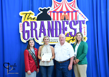 Kourtney Schaff, Saint Anthony, N.D., received the Joseph & Ruby Schaff/Schaff Angus Ranch $500 Scholarship at the 2021 National Junior Angus Show (NJAS) Scholarship Presentation, July 14-16 in Grand Island, Neb. Pictured from left are Miss American Angus Ellie Kidwell, presenting; Kourtney Schaff, recipient; and Barry Pollard, American Angus Association Board member and Angus Foundation chair, and Megan Pelan, National Junior Angus Board Foundation director, both presenting. Since 1998, the Angus Foundation has awarded more than $3.9 million in undergraduate and graduate scholarships to Angus youth. Photo by Pearl's Pics.