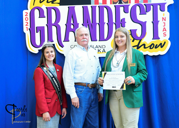 Kelsey Vejraska, Omak, Wash., right, received the Ray Sims Angus $1,000 Scholarship at the 2021 National Junior Angus Show (NJAS) Scholarship Presentation, July 14-16 in Grand Island, Neb. Pictured presenting the award is Miss American Angus Ellie Kidwell, left, and Richard Dyar, American Angus Association Board member, center. Since 1998, the Angus Foundation has awarded more than $3.9 million in undergraduate and graduate scholarships to Angus youth. Photo by Pearl's Pics.
