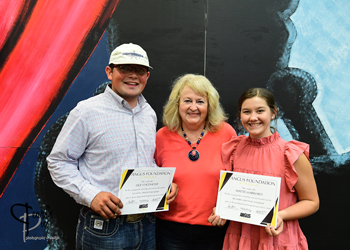 Jace Stagemeyer, Page, Neb., left, and Mattie Harward, Richfield, N.C., right, received a $5,000 scholarship in memory of Richard L. "Dick" Spader, former American Angus Association executive vice president at the 2021 National Junior Angus Show (NJAS) Scholarship Presentation, July 14-16 in Grand Island, Neb. Pictured presenting the awards is Sheri Spader, center. Since 1998, the Angus Foundation has awarded more than $3.9 million in undergraduate and graduate scholarships to Angus youth. Photo by Pearl's Pics.