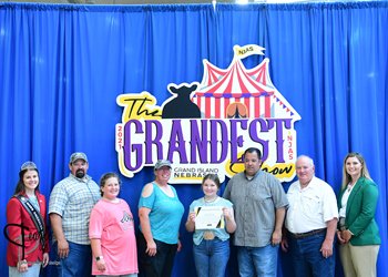 Grace Tekansik, Minden, Nev., received the Gary M. Stoller Jump Start Your LEADership Award at the 2021 National Junior Angus Show (NJAS) Scholarship Presentation, July 14-16 in Grand Island, Neb. Pictured from left are Miss American Angus Ellie Kidwell, and Brian, Mckinley, and Tiffany Stoller, all presenting; Grace Tekansik, recipient; Scott Stoller, Barry Pollard, American Angus Association Board member and Angus Foundation chair, and Megan Pelan, National Junior Angus Board Foundation director, all presenting. Photo by Pearl's Pics.