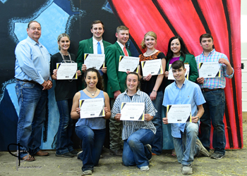 These junior members received the Angus Foundation Undergraduate $2,500 scholarship at the 2021 National Junior Angus Show (NJAS) Scholarship Presentation, July 14-16 in Grand Island, Neb. Pictured from left are Ryan Borer, Buchanan, Va.; Lynae Bowman, Germanton, N.C.; Avery Dull, Westminster, Md.; Bree Gaffney, Barneveld, Wis.; Marcie Harward, Richfield, N.C.; Alex Vieselmeyer, Amherst, Colo.; Amelia Miller, Gridley, Ill.; Colby Perry, Prather, Calif.; Isaac Rhode, Stewartsville, Mo.; Elizabeth Rone, Courtland, Miss.; and Barry Pollard, American Angus Association Board member and Angus Foundation chair. Since 1998, the Angus Foundation has awarded more than $3.9 million in undergraduate and graduate scholarships to Angus youth. Photo by Pearl's Pics.