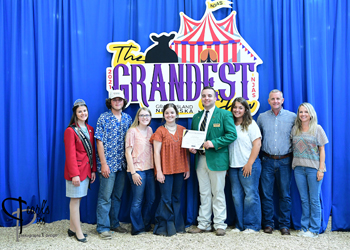Justin Wood, Willow Spring, N.C., received the DeEtta Wood Memorial $1,500 Scholarship at the 2021 National Junior Angus Show (NJAS) Scholarship Presentation, July 14-16 in Grand Island, Neb. Pictured from left are Miss American Angus Ellie Kidwell, Riley, Charlotte and Mary Wood, all presenting; Justin Wood, recipient; and Ava Wood, Jeff Wood and Kasey Harrison, all presenting. Since 1998, the Angus Foundation has awarded more than $3.9 million in undergraduate and graduate scholarships to Angus youth. Photo by Pearl's Pics.
