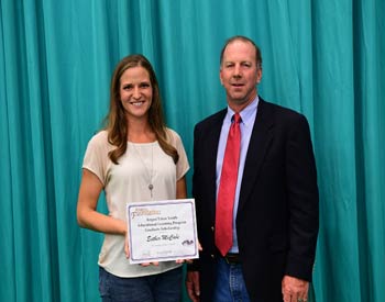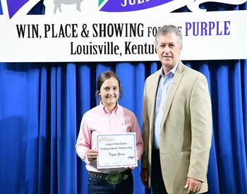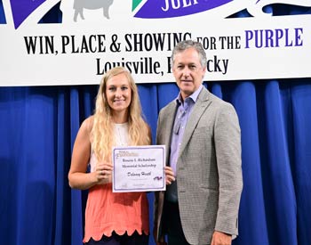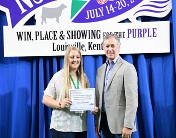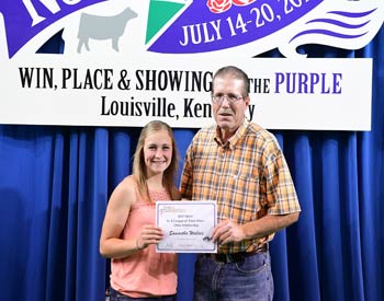 Delaney Heath, Cookeville, Md., left, received the Roscoe L. Richardson Memorial $500 Scholarship at the 2019 National Junior Angus Show (NJAS) Scholarship Presentation, July 18 in Louisville, Ky. Pictured presenting the award is Rod Schoenbine, Angus Foundation director of development. Since 1998, the Angus Foundation has awarded more than $2.9 million in undergraduate and graduate scholarships to Angus youth. Photo by Pearls Pics, on behalf of the American Angus Association.
