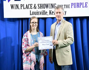 Kalli Flanders, Buffalo, Ky., left, received the Angus Foundation Undergraduate $3,000 scholarship at the 2019 National Junior Angus Show (NJAS) Scholarship Presentation, July 18 in Louisville, Ky. Pictured presenting the award is Rod Schoenbine, Angus Foundation director of development. Since 1998, the Angus Foundation has awarded more than $2.9 million in undergraduate and graduate scholarships to Angus youth. Photo by Pearls Pics, on behalf of the American Angus Association.