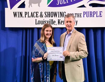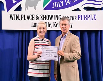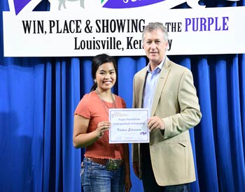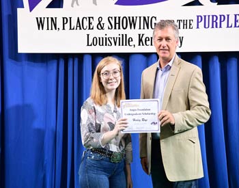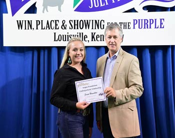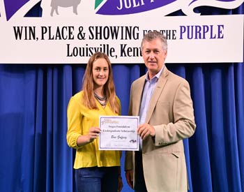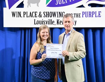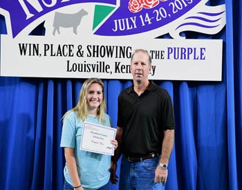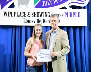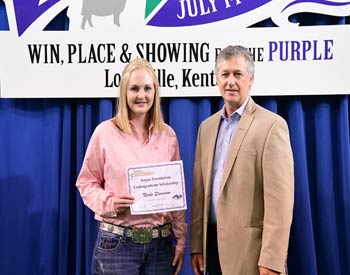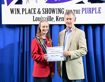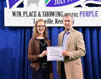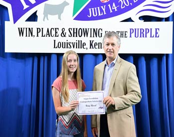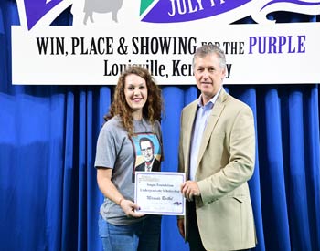 Holly Marsh, Union, Ill., received the Angus Foundation Undergraduate $1,000 scholarship at the 2019 National Junior Angus Show (NJAS) Scholarship Presentation, July 18 in Louisville, Ky. Pictured presenting the award is Rod Schoenbine, Angus Foundation director of development. Since 1998, the Angus Foundation has awarded more than $2.9 million in undergraduate and graduate scholarships to Angus youth. Photo by Pearls Pics, on behalf of the American Angus Association.