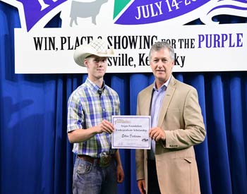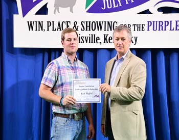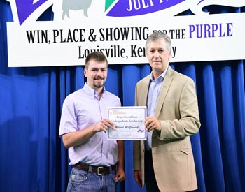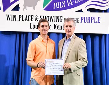 Zach McCall, Greenville, Va., left, received the Angus Foundation Undergraduate $3,000 scholarship at the 2019 National Junior Angus Show (NJAS) Scholarship Presentation, July 18 in Louisville, Ky. Pictured presenting the award is Rod Schoenbine, Angus Foundation director of development. Since 1998, the Angus Foundation has awarded more than $2.9 million in undergraduate and graduate scholarships to Angus youth. Photo by Pearls Pics, on behalf of the American Angus Association.