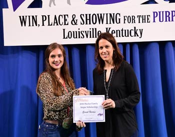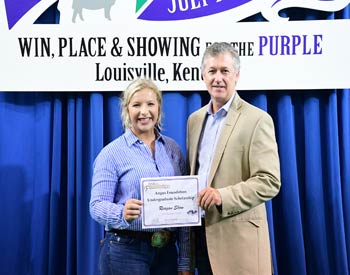 Hailey Roye, Fayetteville, Ark., left, received the Angus Foundation Undergraduate $3,000 scholarship at the 2019 National Junior Angus Show (NJAS) Scholarship Presentation, July 18 in Louisville, Ky. Pictured presenting the award is Rod Schoenbine, Angus Foundation director of development. Since 1998, the Angus Foundation has awarded more than $2.9 million in undergraduate and graduate scholarships to Angus youth. Photo by Pearls Pics, on behalf of the American Angus Association.