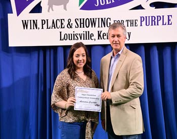 Jenna Hamilton, Buena Vista, Va., left, received the Angus Foundation Undergraduate $3,000 scholarship at the 2019 National Junior Angus Show (NJAS) Scholarship Presentation, July 18 in Louisville, Ky. Pictured presenting the award is Rod Schoenbine, Angus Foundation director of development. Since 1998, the Angus Foundation has awarded more than $2.9 million in undergraduate and graduate scholarships to Angus youth. Photo by Pearls Pics, on behalf of the American Angus Association.