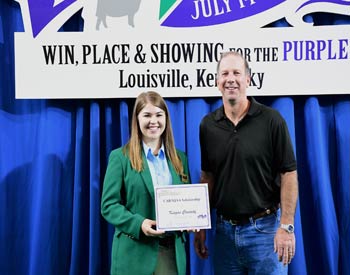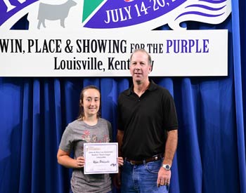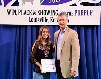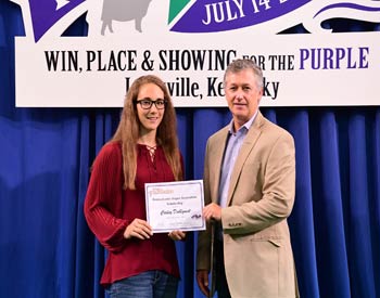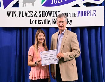 Cailey Dahlquist, Washington, Pa., left, received the Pennsylvania Angus Association $500 Scholarship at the 2019 National Junior Angus Show (NJAS) Scholarship Presentation, July 18 in Louisville, Ky. Pictured presenting the award is Rod Schoenbine, Angus Foundation director of development. Since 1998, the Angus Foundation has awarded more than $2.9 million in undergraduate and graduate scholarships to Angus youth. Photo by Pearls Pics, on behalf of the American Angus Association.