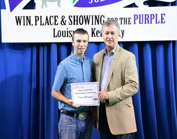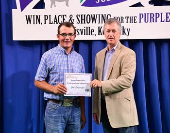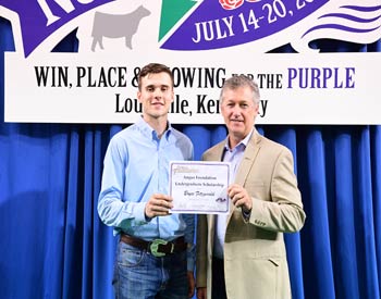 Ethan Dickerson, Paradise, Kan., left, received the Angus Foundation Undergraduate $3,000 scholarship at the 2019 National Junior Angus Show (NJAS) Scholarship Presentation, July 18 in Louisville, Ky. Pictured presenting the award is Rod Schoenbine, Angus Foundation director of development. Since 1998, the Angus Foundation has awarded more than $2.9 million in undergraduate and graduate scholarships to Angus youth. Photo by Pearls Pics, on behalf of the American Angus Association.